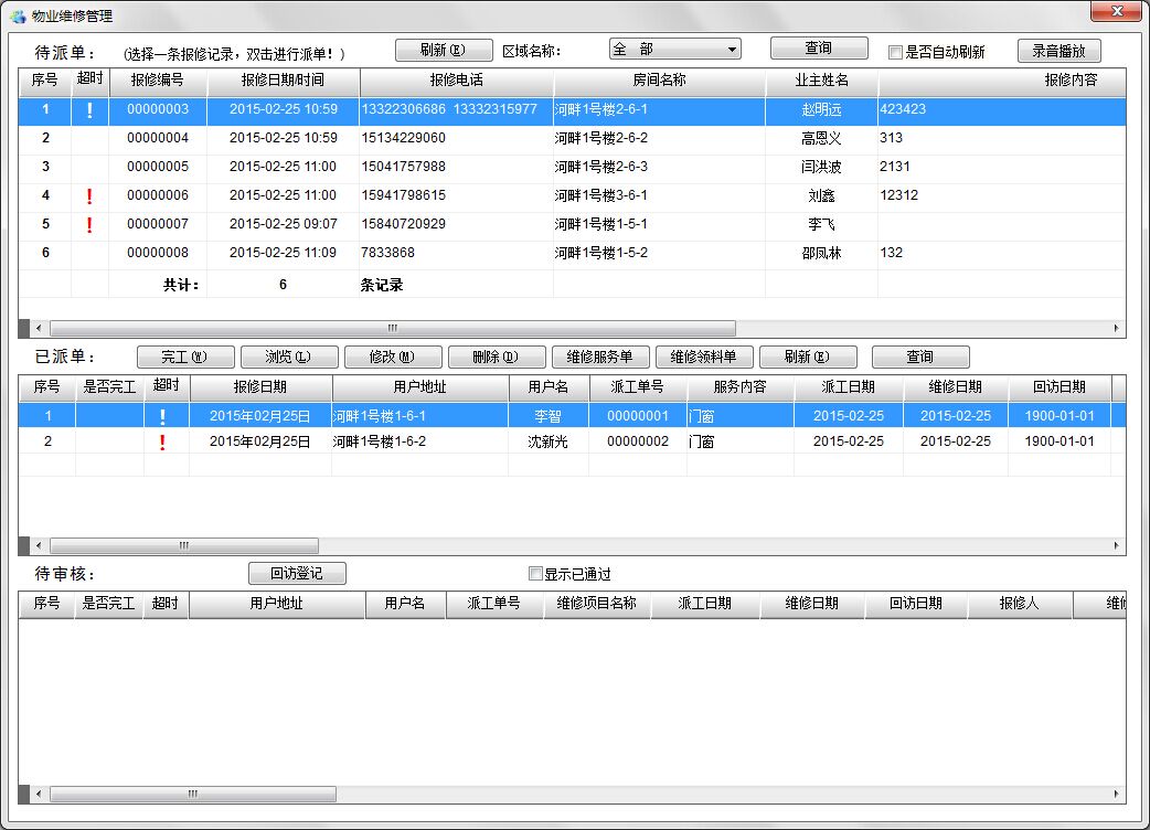如果業(yè)主通過電話報(bào)修,根據(jù)業(yè)主檔案登記的聯(lián)系方式(電話、及緊急聯(lián)系電話)系統(tǒng)可以彈屏提示業(yè)主詳細(xì)信息,直接進(jìn)行報(bào)修操作。